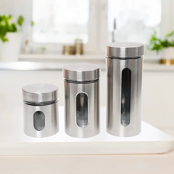 Set x3 tarros para cocinaCierre herméticoMedidas: 10cm / 15cm / 20cmMaterial: Vidrio + Acero inoxidable